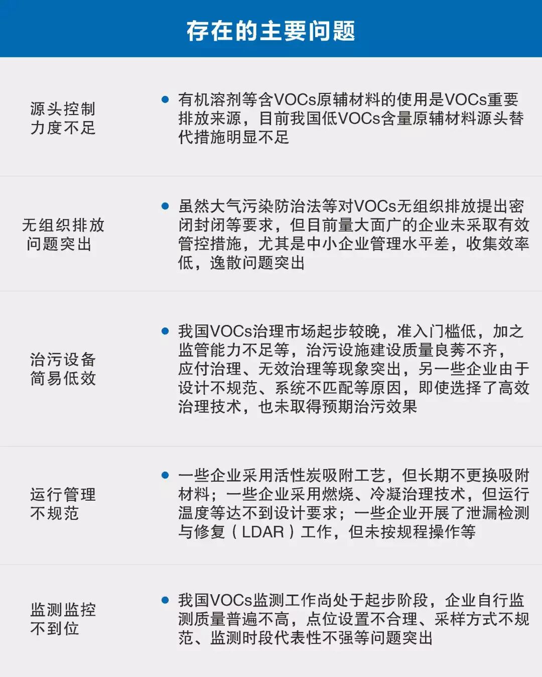 一些地区制定地方排放标准,加强VOCs监测、监控、报告、统计等基础能力建设,取得一些进展。但VOCs治理工作依然薄弱,主要存在5个问题: